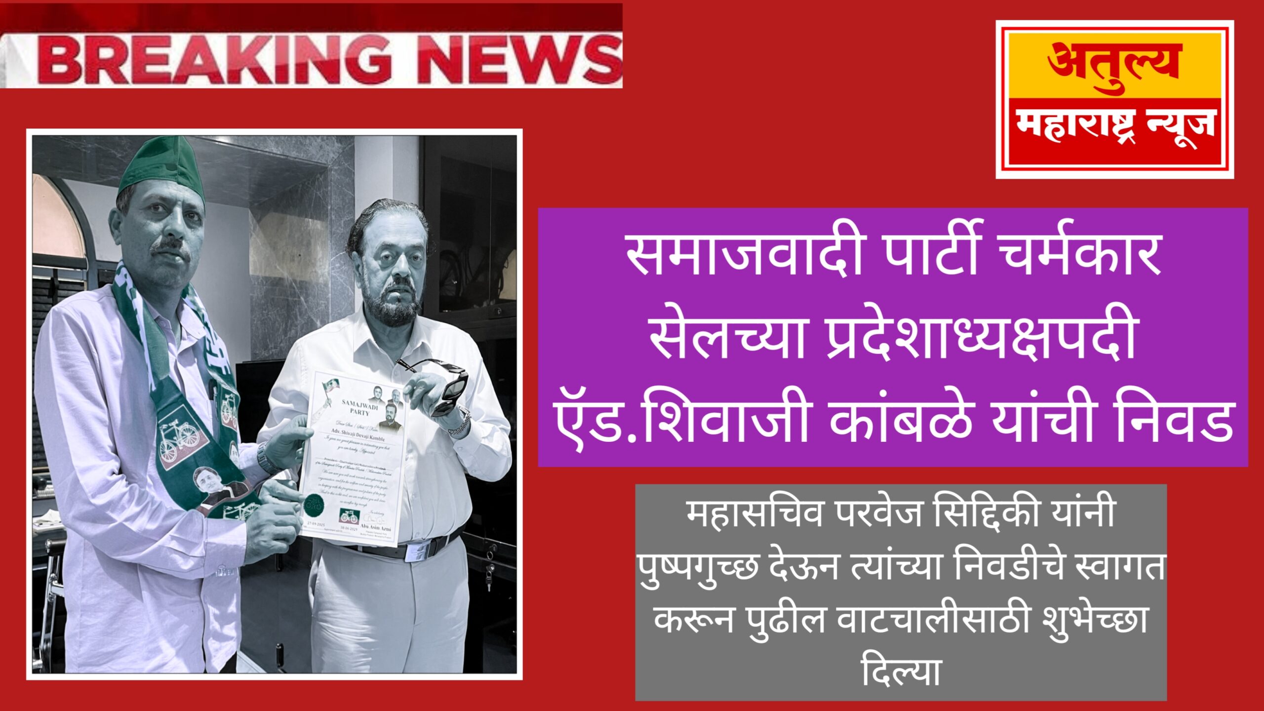 ऍड.शिवाजी देवाजी कांबळे यांनी समाजवादी पार्टीमध्ये मागील २० वर्षांपासून केज विधानसभा अध्यक्ष म्हणून अतिशय चांगले काम केले. तसेच त्यांनी समाजवादी पार्टीकडून केज विधानसभेचे उमेदवार म्हणून ही निवडणूक लढवलेली आहे. सामाजिक व राजकीय कार्याचा त्यांना मोठा अनुभव आहे. एक कुशल संघटक, अभ्यासू वक्ते, समाजवादी पार्टीचे निष्ठावंत कार्यकर्ते म्हणून ही त्यांची सर्वत्र ओळख आहे. सोमनाथ बोरगाव गांवचे सरपंच, अंबाजोगाई वकील संघाचे उपाध्यक्ष, समाजवादी पार्टीच्या प्रदेश कार्यकारिणीचे सदस्य व सध्या समाजवादी पार्टीचे प्रदेशसचिव म्हणून काम करीत असणाऱ्या ऍड.शिवाजी कांबळे यांच्या सातत्यपूर्ण कार्याची नोंद व दखल घेऊन चांभारगड या किल्ल्यास पर्यटन क्षेत्र ‘क’ दर्जा मिळावा यासाठी सातत्याने प्रयत्न करीत असल्यामुळे ही चर्मकार समाज सेलच्या प्रदेशाध्यक्षपदी ऍड.कांबळे यांची निवड करण्यात आली. त्यांना निवडीचे पत्र प्रदेशाध्यक्ष आमदार अबू असीम आझमी यांनी दिले. तर महासचिव परवेज सिद्दिकी यांनी पुष्पगुच्छ देऊन त्यांच्या निवडीचे स्वागत करून पुढील वाटचालीसाठी शुभेच्छा दिल्या. त्यावेळी समाजवादी पार्टीचे प्रदेश उपाध्यक्ष पी.डी.जोशी पाटोदेकर, प्रदेश महासचिव अंनिस अहमद, प्रदेश महासचिव राहुल गायकवाड, प्रदेश महासचिव मुंबई मेहराज सिद्दिकी, प्रदेश महासचिव शेख रऊफ, शेख अखिल भाई, प्रदेश सचिव गुड्डू ककार, ऍड.रेवण भोसले, महिला आघाडी प्रदेशाध्यक्ष मायाताई चौरे, युवकचे प्रदेशाध्यक्ष कृष्णा रोचकरी, रूपेश शेवाळे, कुलदीप, प्रदीप कपिनेयनाथ, राजू यांच्यासह महाराष्ट्रातील व मुंबईतील चर्मकार चांभार समाज बांधवांनी हार्दिक अभिनंदन करून पुढील कार्यास शुभेच्छा दिल्या.