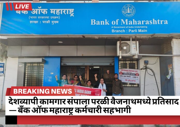 देशव्यापी कामगार संपाला परळी वैजनाथमध्ये प्रतिसाद — बँक ऑफ महाराष्ट्र कर्मचारी सहभागी